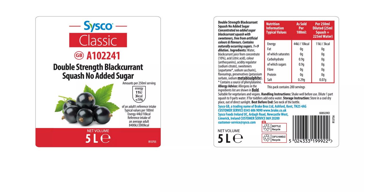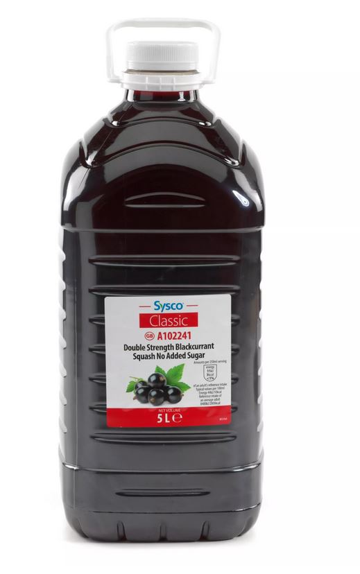 Sysco Classic Double Strength Blackcurrant Squash No Added Sugar 5 Litres